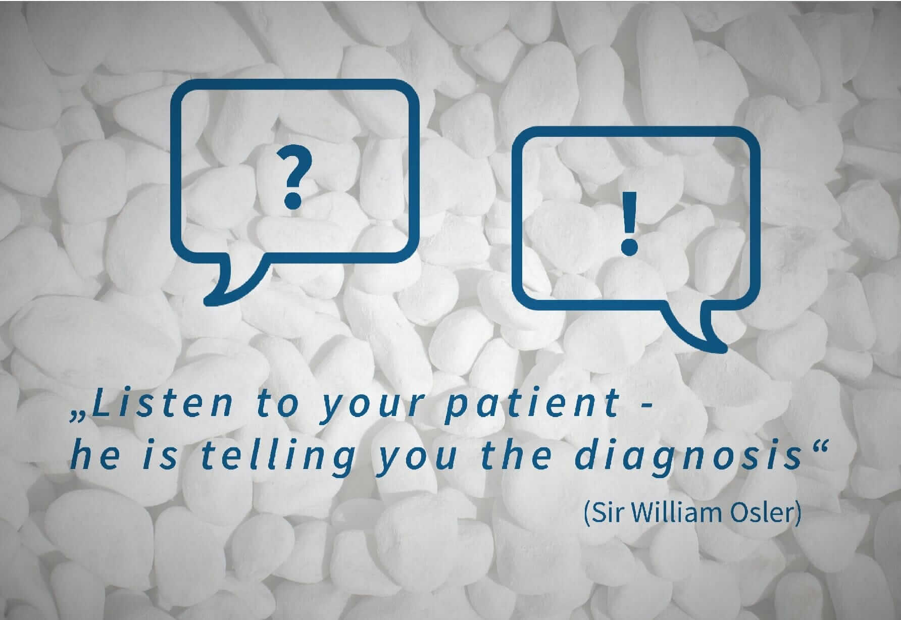 Sir William Osler, ein kanadischer Mediziner, der als „Vater der modernen Medizin“ die Arztausbildung revolutionierte, war überzeugt von der Bedeutung der Anamnese als eines der zuverlässigsten Diagnostika: „Listen to your patient, he is telling you the diagnosis.“ Diese Einsicht wurde durch klinische Studien inzwischen eindeutig belegt: Bereits 1975 versuchten der Forscher J. R. Hampton und sein Team den Prozess der Diagnose genau zu beleuchten (Hampton et al.: Relative contributions of history-taking, physical examination, and laboratory investigation to diagnosis and management of medical outpatients (1975)). Er ging dabei davon aus, dass Diagnosen von drei verschiedenen Komponenten abhängig sind, die je nach Krankheitsbild eine unterschiedliche Gewichtung erfahren: die körperliche Untersuchung auf Basis der Leitsymptome, die Untersuchung unter Zuhilfenahme laborativer Methoden und – wozu wohl auch Sokrates schon geraten hätte – die Erhebung der Patientengeschichte, die Anamnese. Hampton Jr konnte nachweisen, dass die Bedeutung der Anamnese für den Diagnoseprozess nicht zu unterschätzen ist. Selbst bei Krankheiten, über die letztlich nur das Labor einen eindeutigen Befunden liefern kann, lieferte die Anamnese vielfach erst die richtige Spur. Hampton ermunterte deshalb zu einer ausführlichen und gewissenhaften Anamnese, „knowing that extra time spent on the history is likely to be more profitable than extra time spent on the physical examination (Hampton et al. 1975: 489). Um auch nachfolgende Generationen von Ärzten für die Chancen der Anamnese zu sensibilisieren, appellierte er außerdem daran, das Einüben zielführender Fragetechniken in die medizinische Ausbildung zu integrieren.